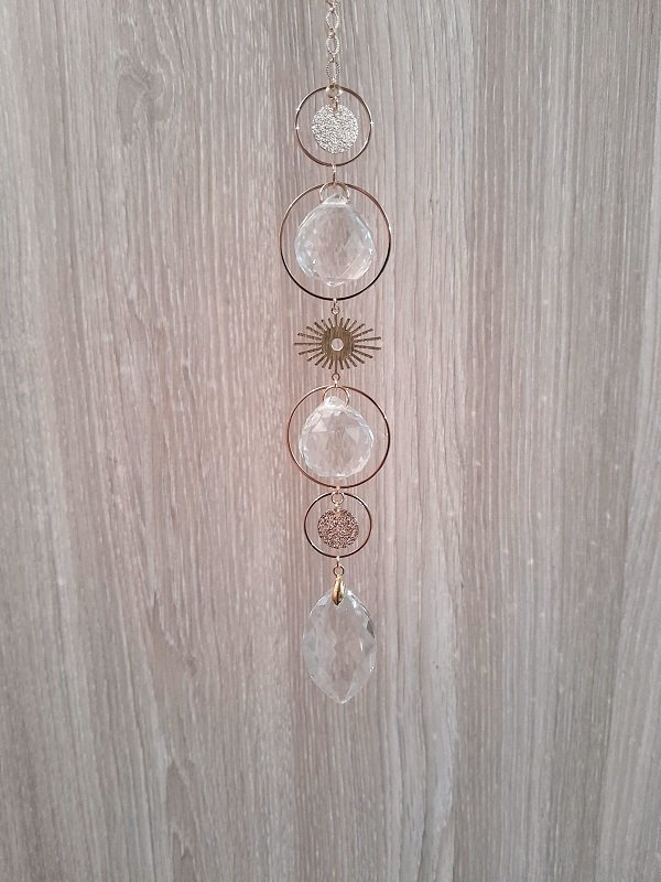 L’attrape-soleil cristal soleil fait 43 cm avec cristaux ronds et en goutte, connecteur soleil et pendentifs ronds dorés texturés.